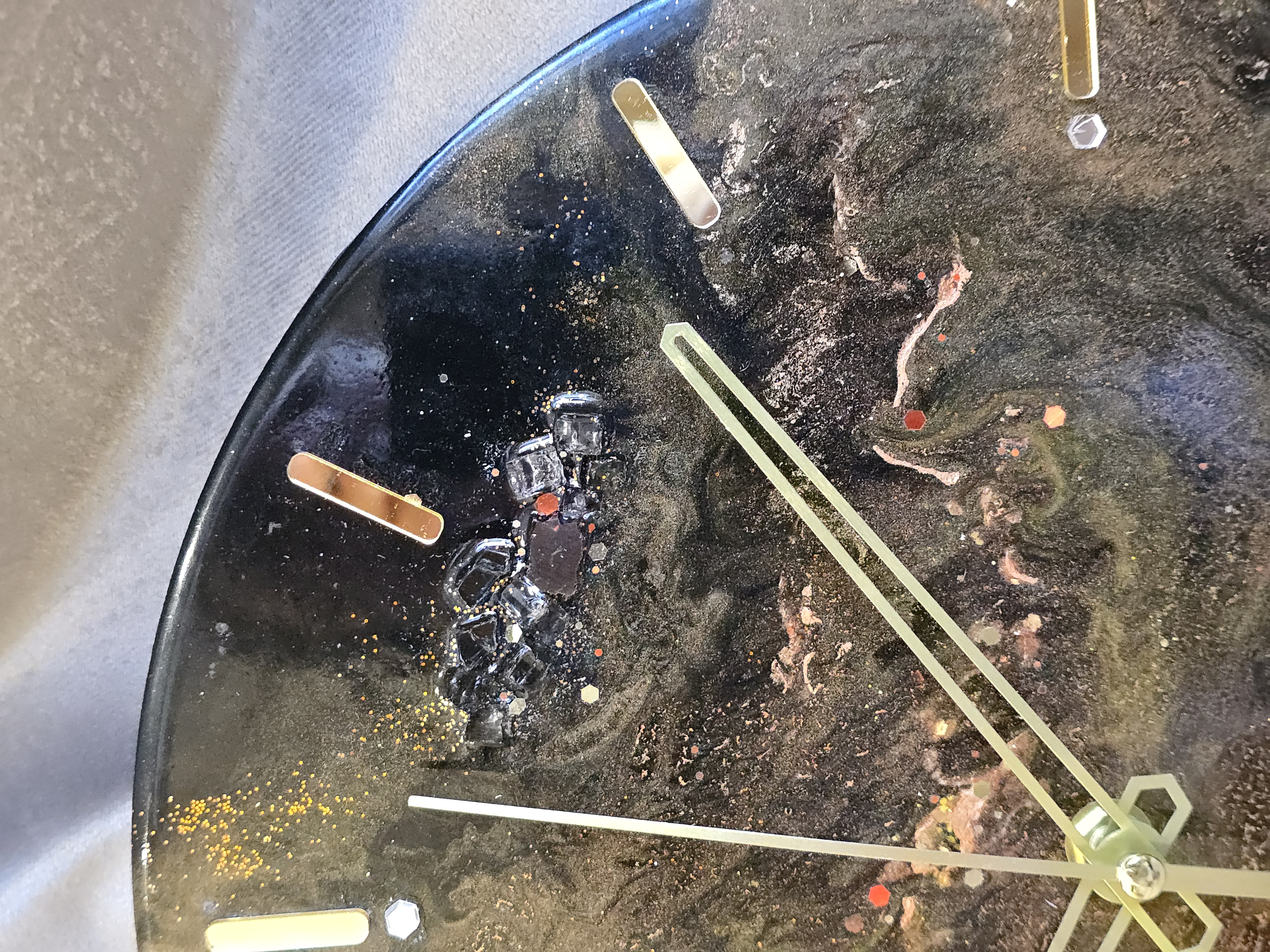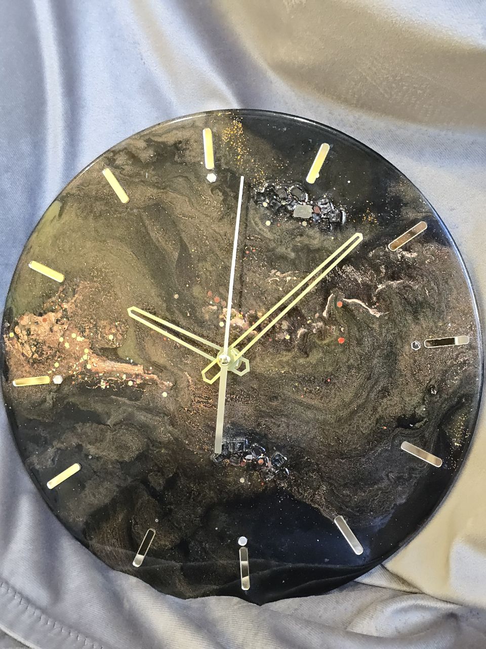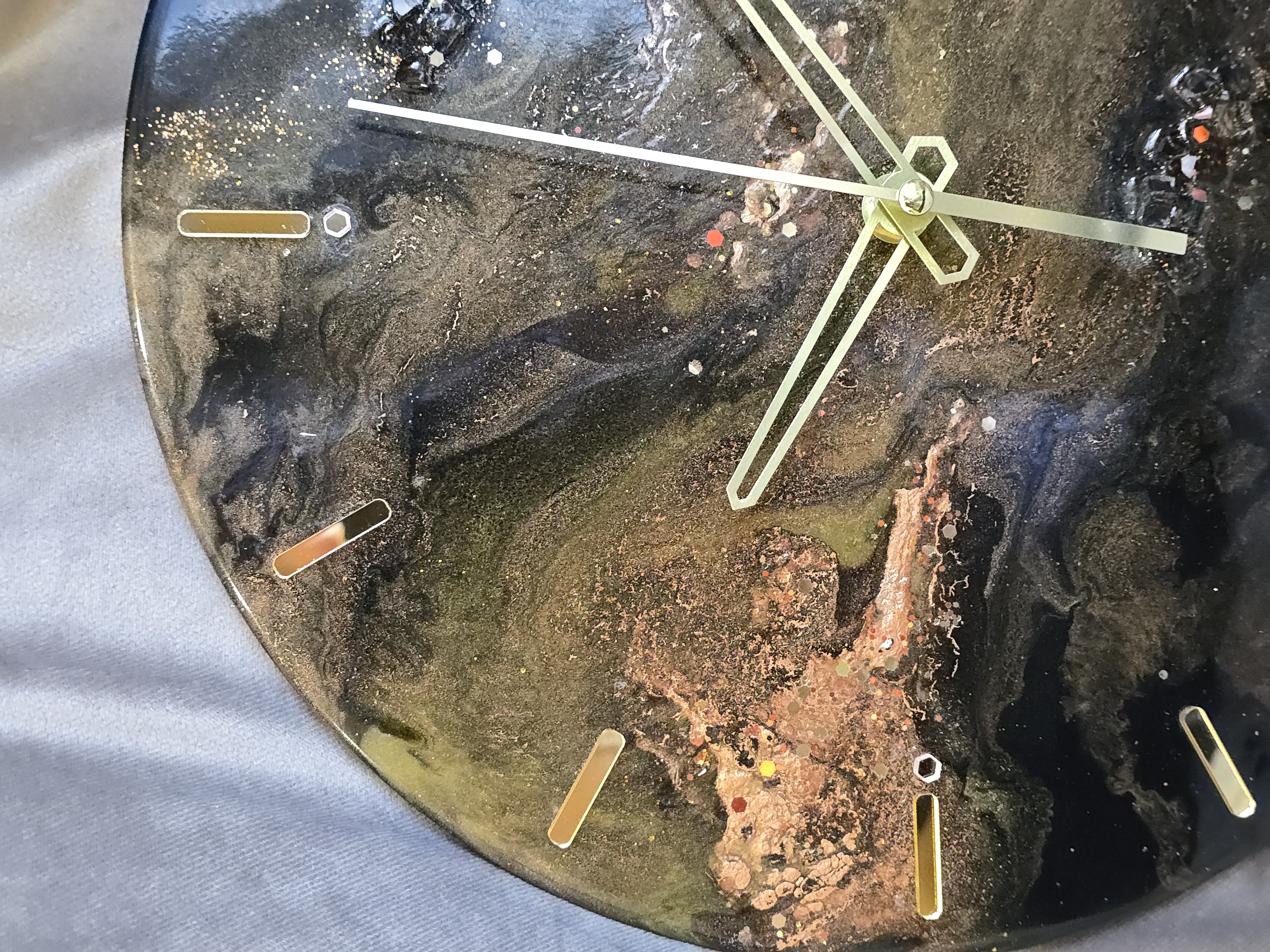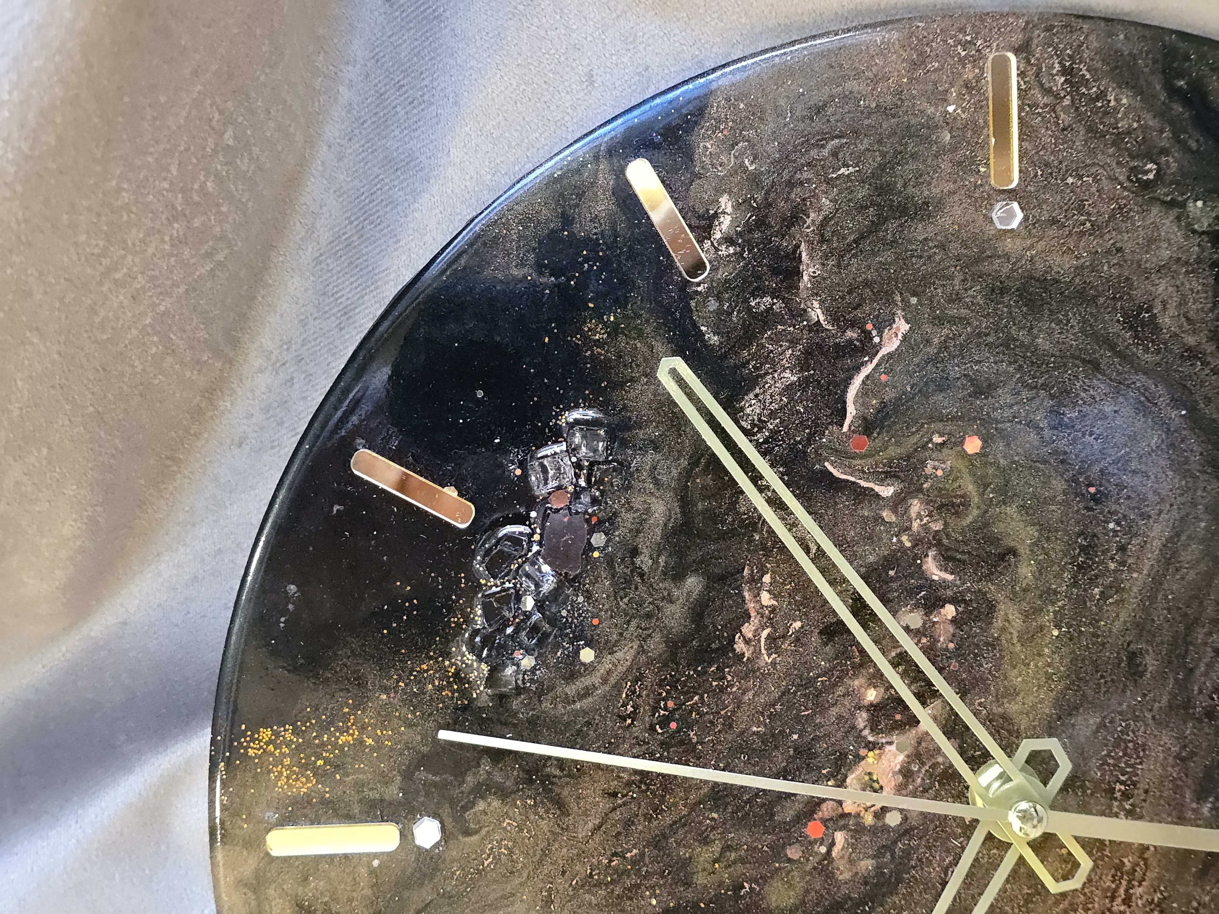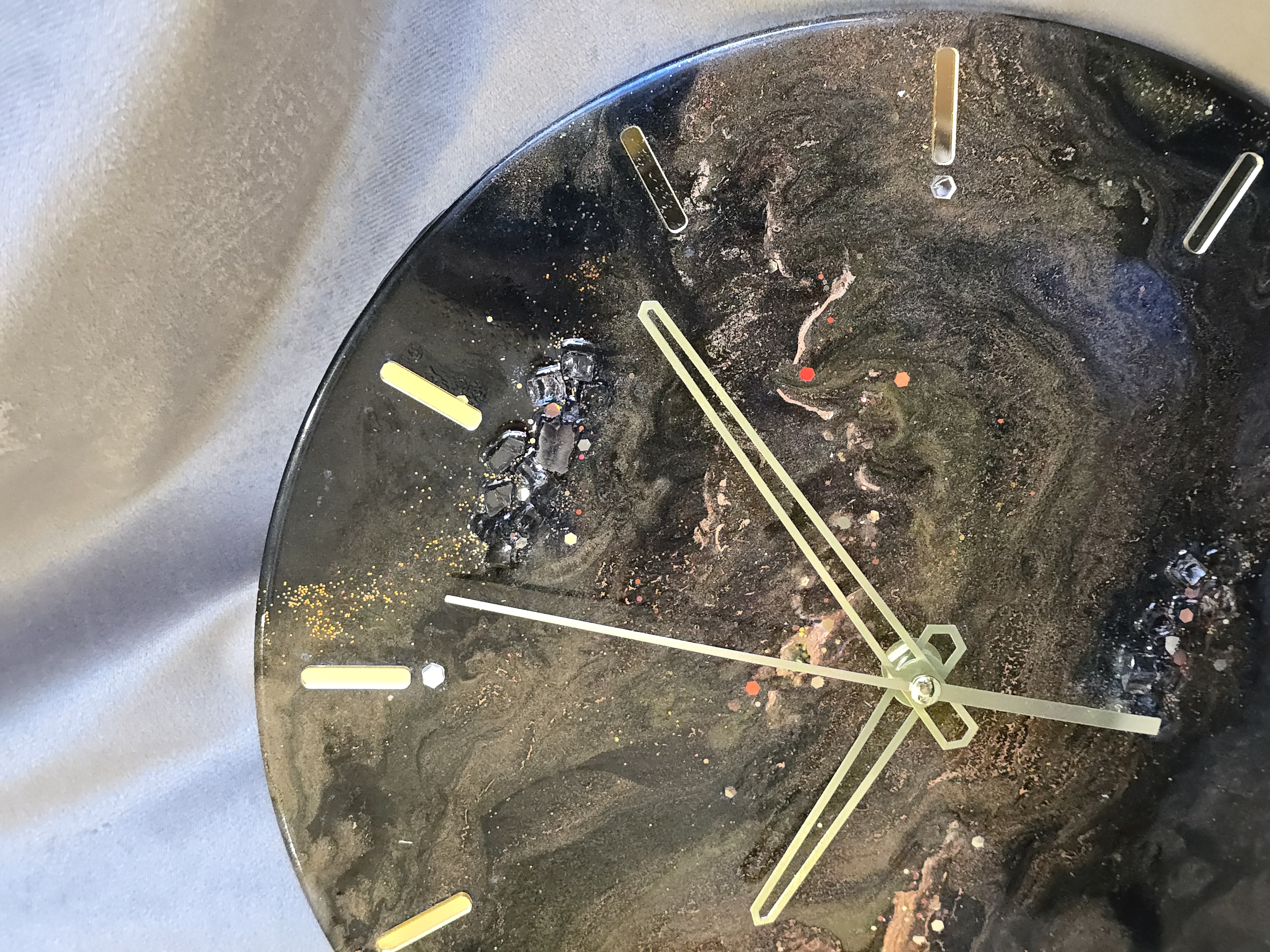 Перед вами — не просто циферблат со стрелками, а арт-объект, создающий настроение в комнате. Тёмная эпоксидная смола с золотистыми и серебристыми вкраплениями напоминает звёздное небо или далёкую туманность. Каждый слой залит вручную — поэтому двух одинаковых часов не существует.