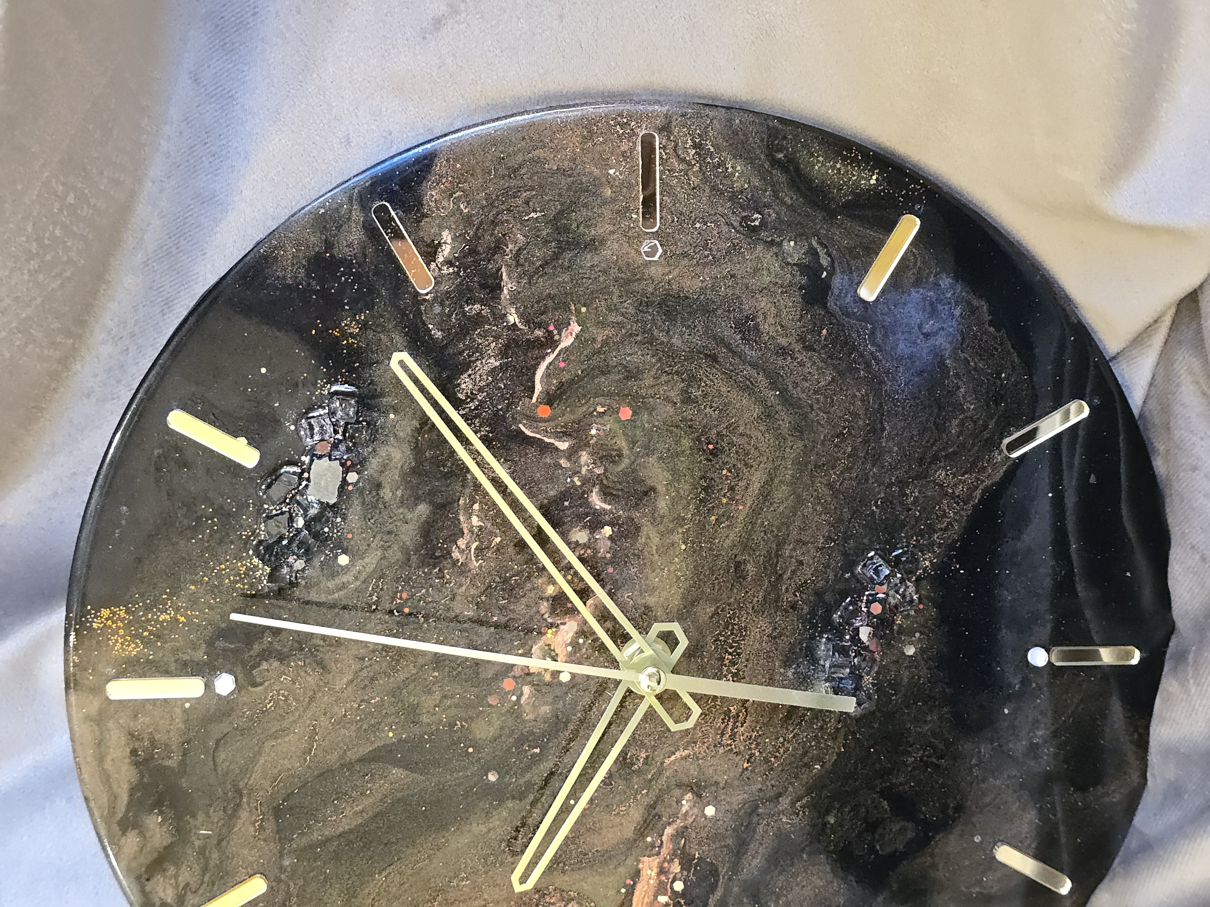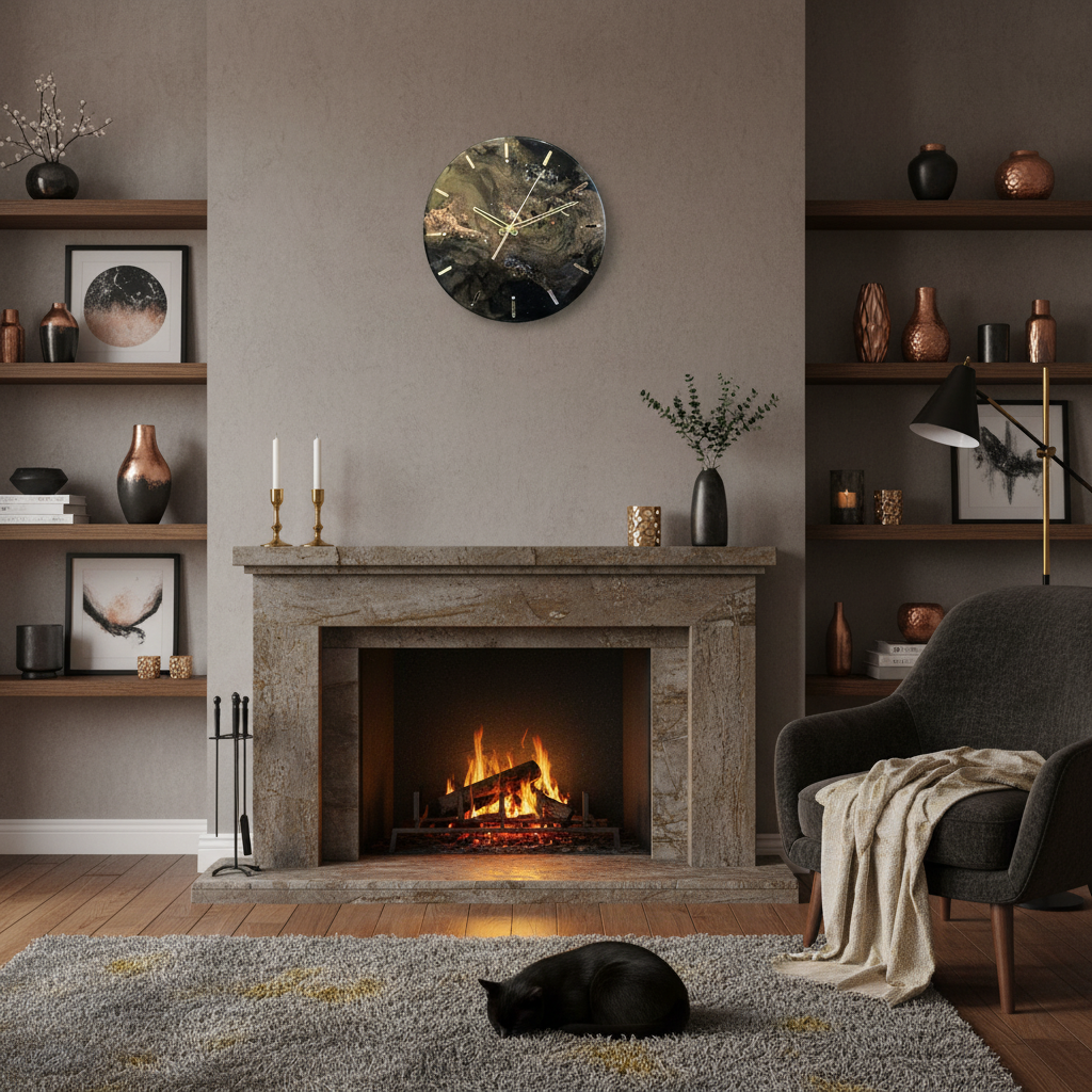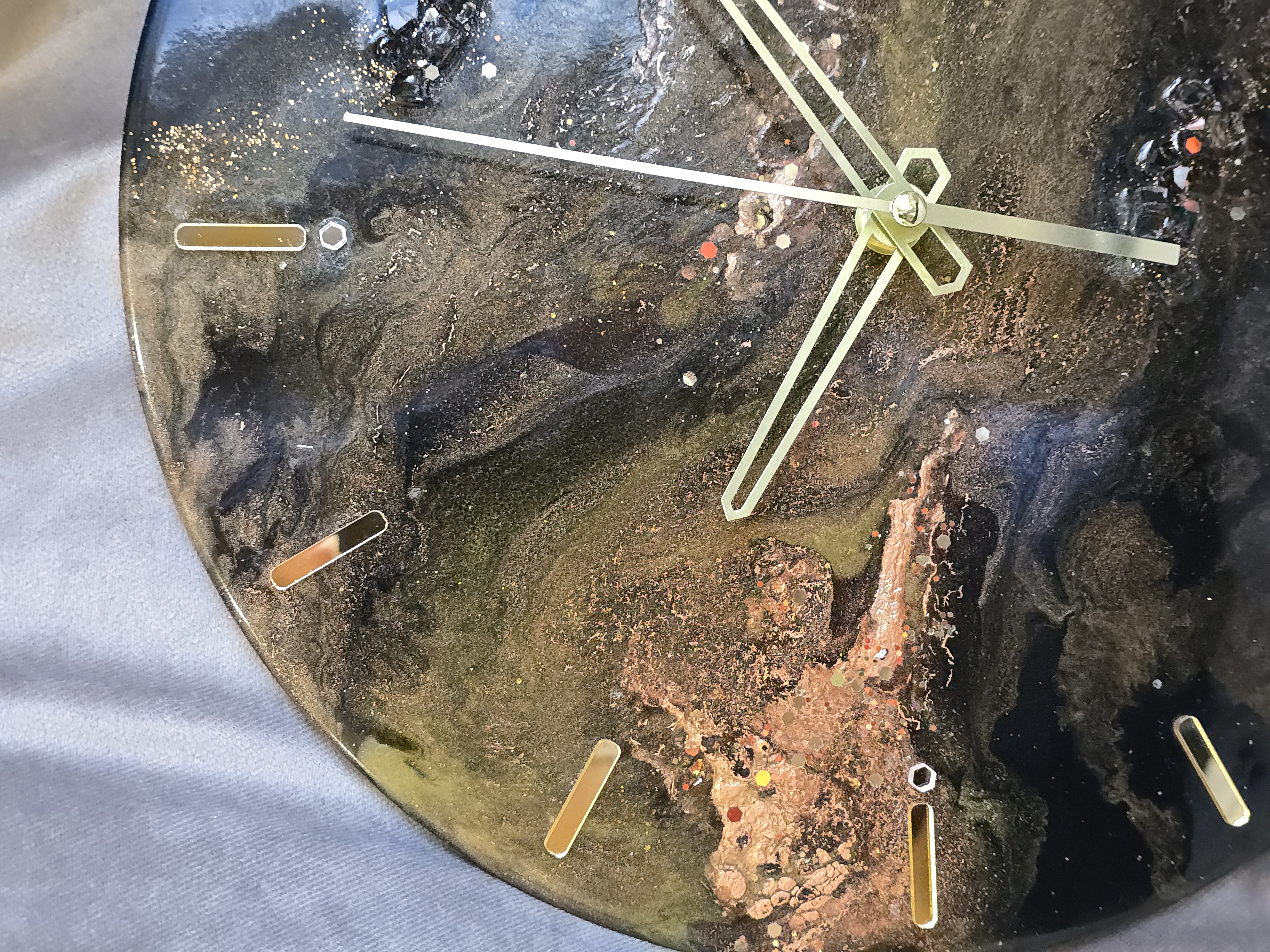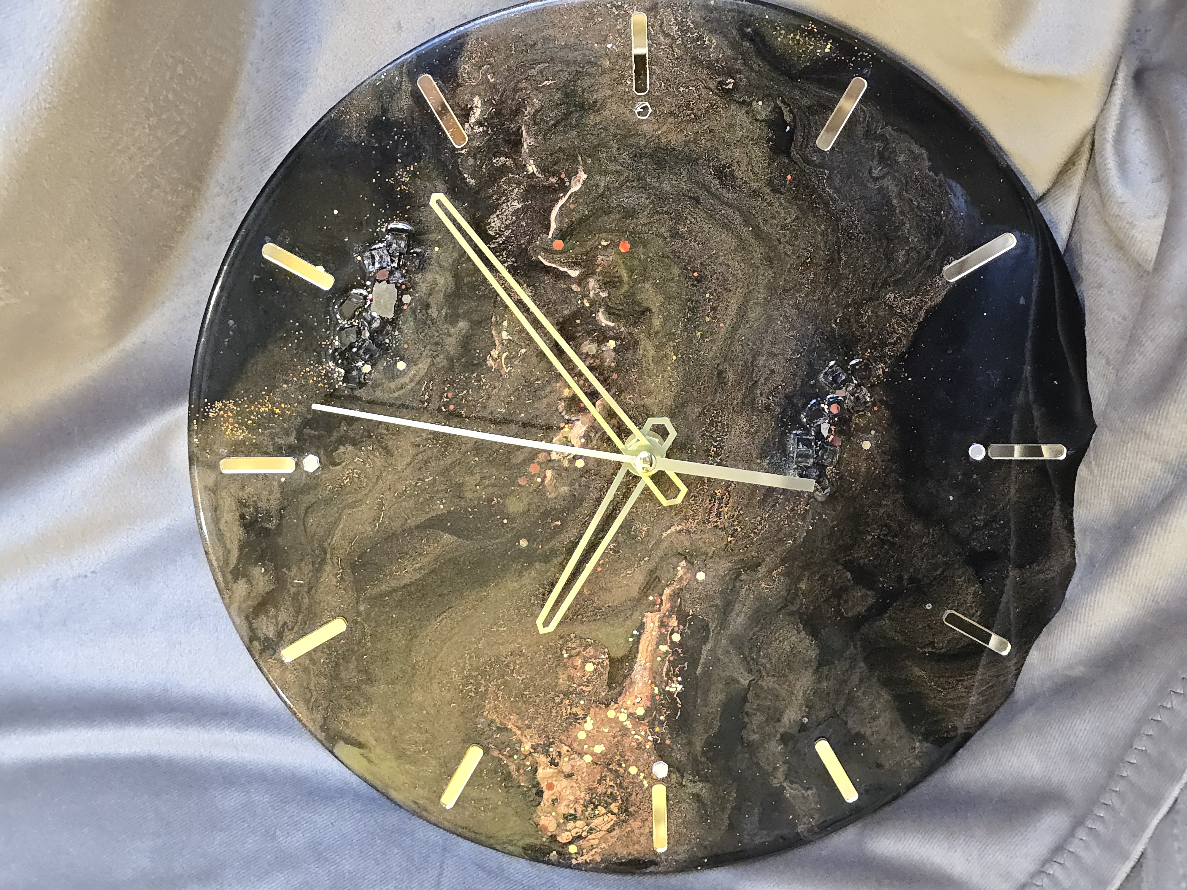 Перед вами — не просто циферблат со стрелками, а арт-объект, создающий настроение в комнате. Тёмная эпоксидная смола с золотистыми и серебристыми вкраплениями напоминает звёздное небо или далёкую туманность. Каждый слой залит вручную — поэтому двух одинаковых часов не существует.