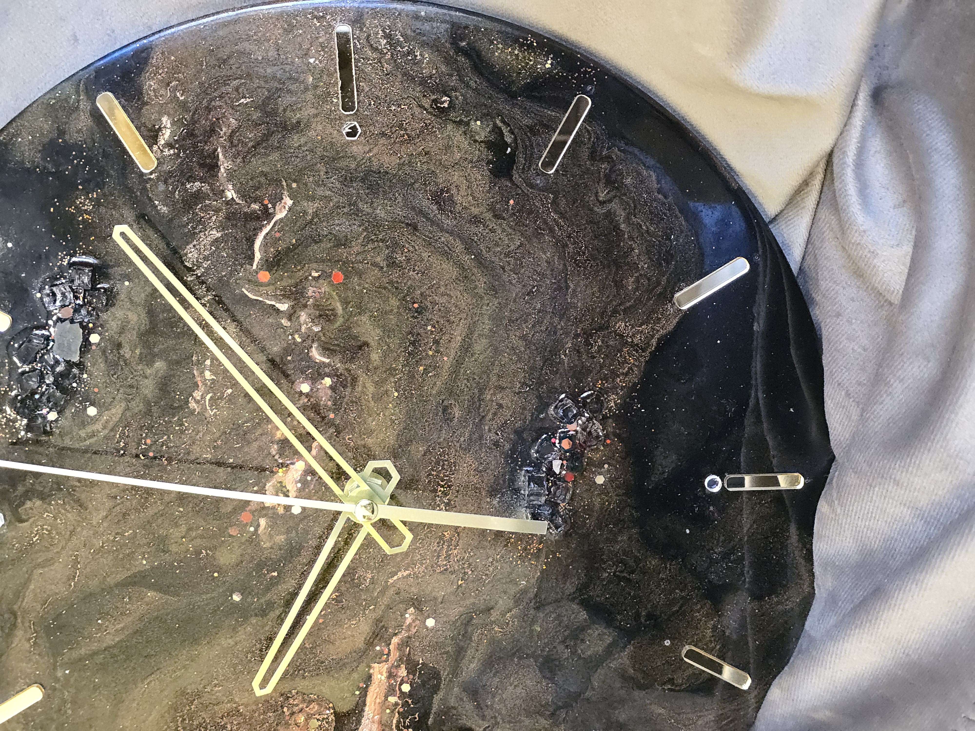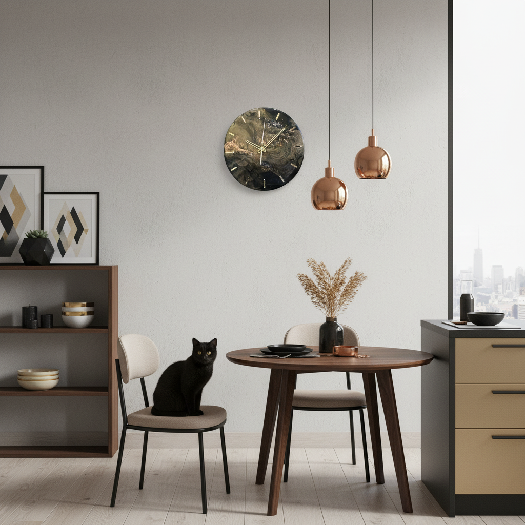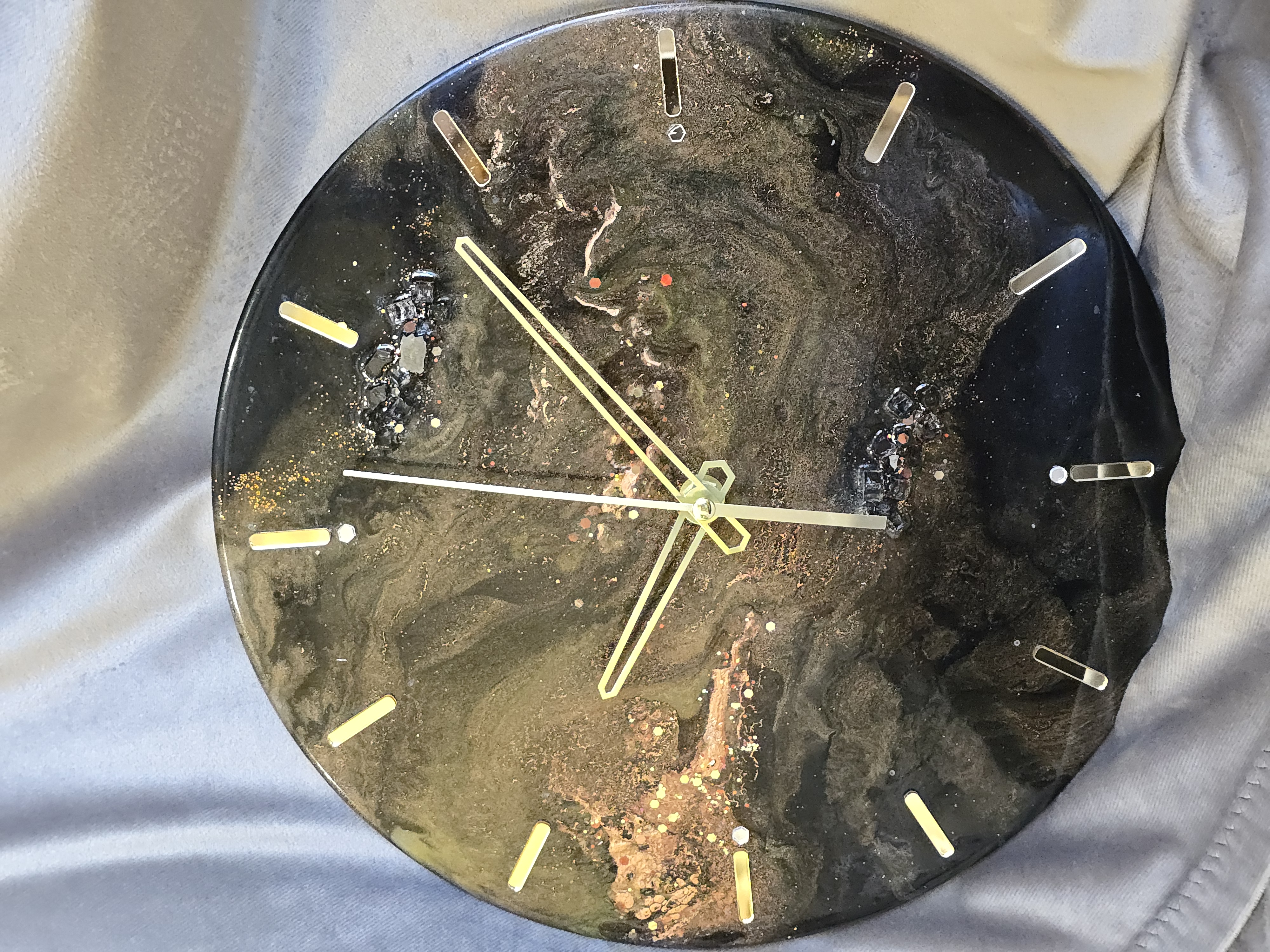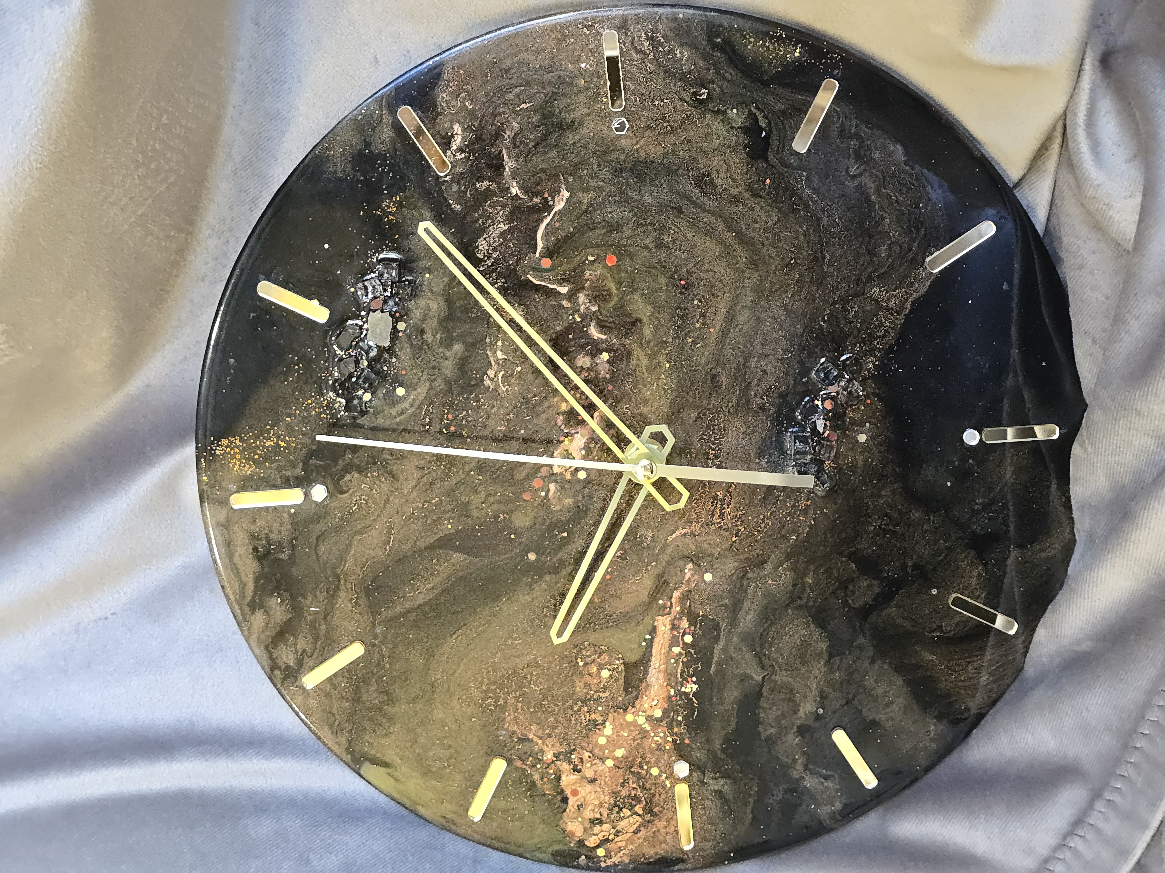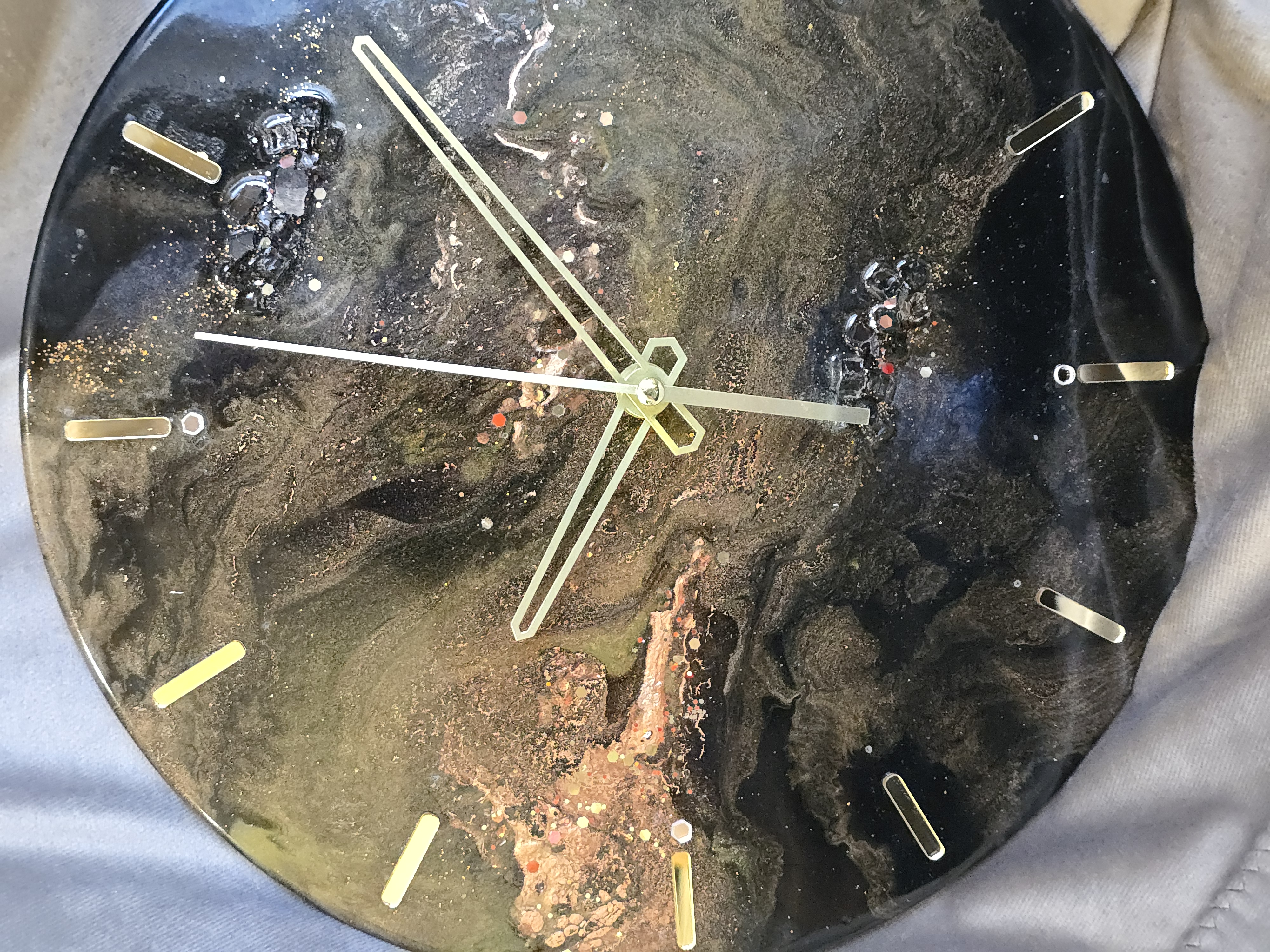 Перед вами — не просто циферблат со стрелками, а арт-объект, создающий настроение в комнате. Тёмная эпоксидная смола с золотистыми и серебристыми вкраплениями напоминает звёздное небо или далёкую туманность. Каждый слой залит вручную — поэтому двух одинаковых часов не существует.