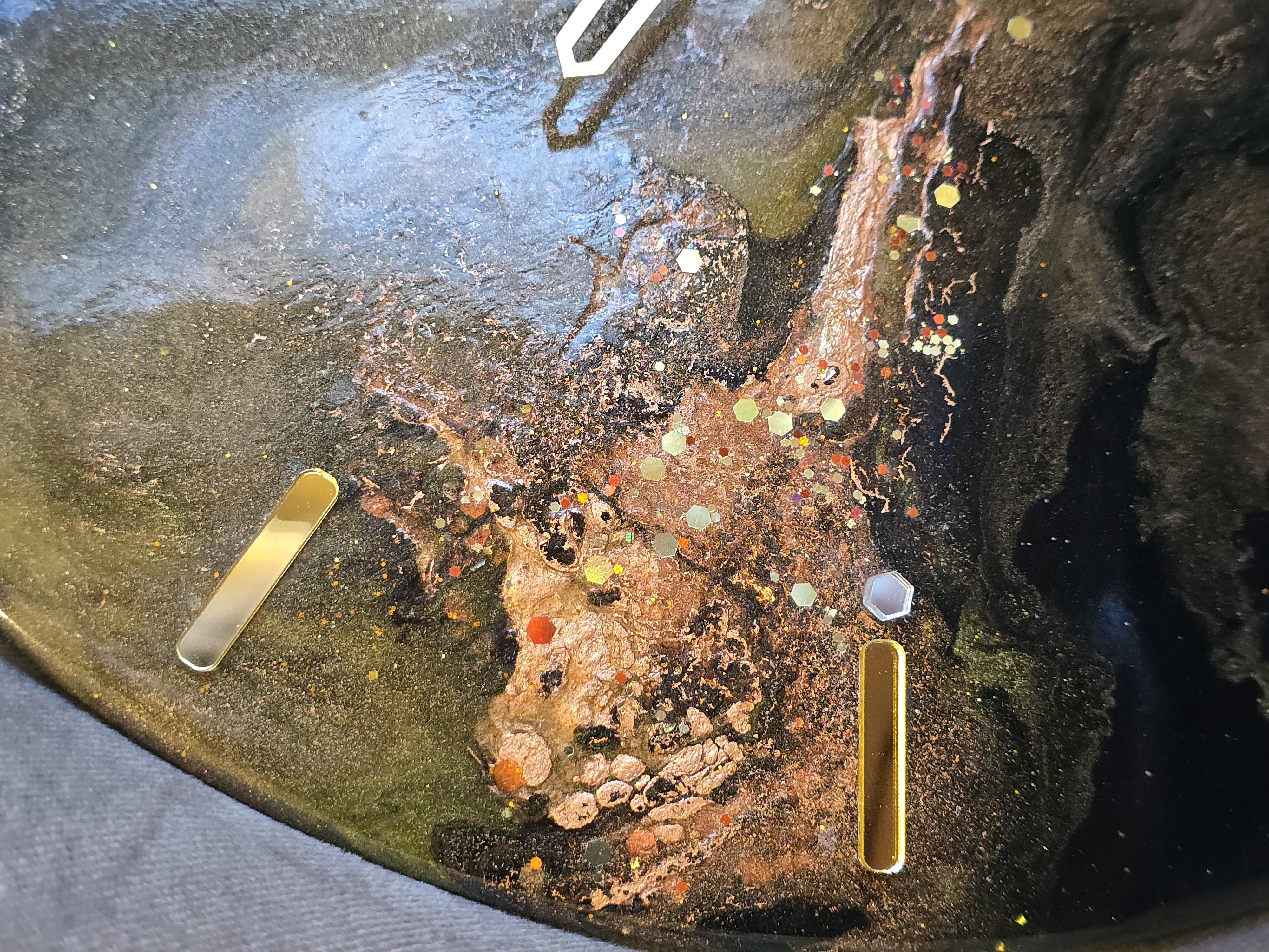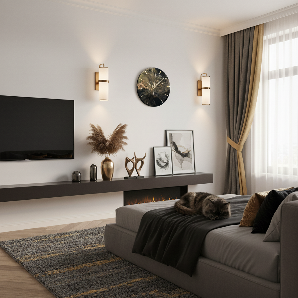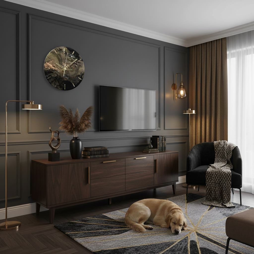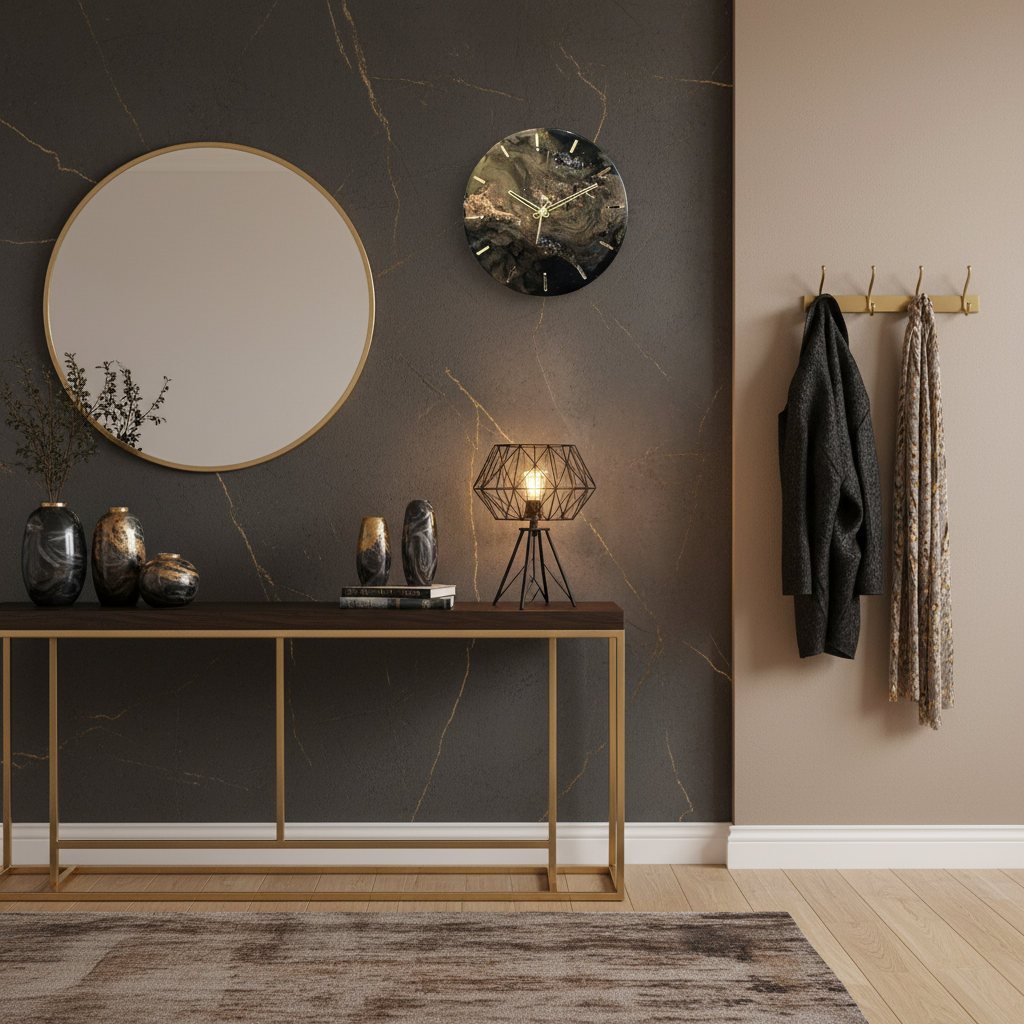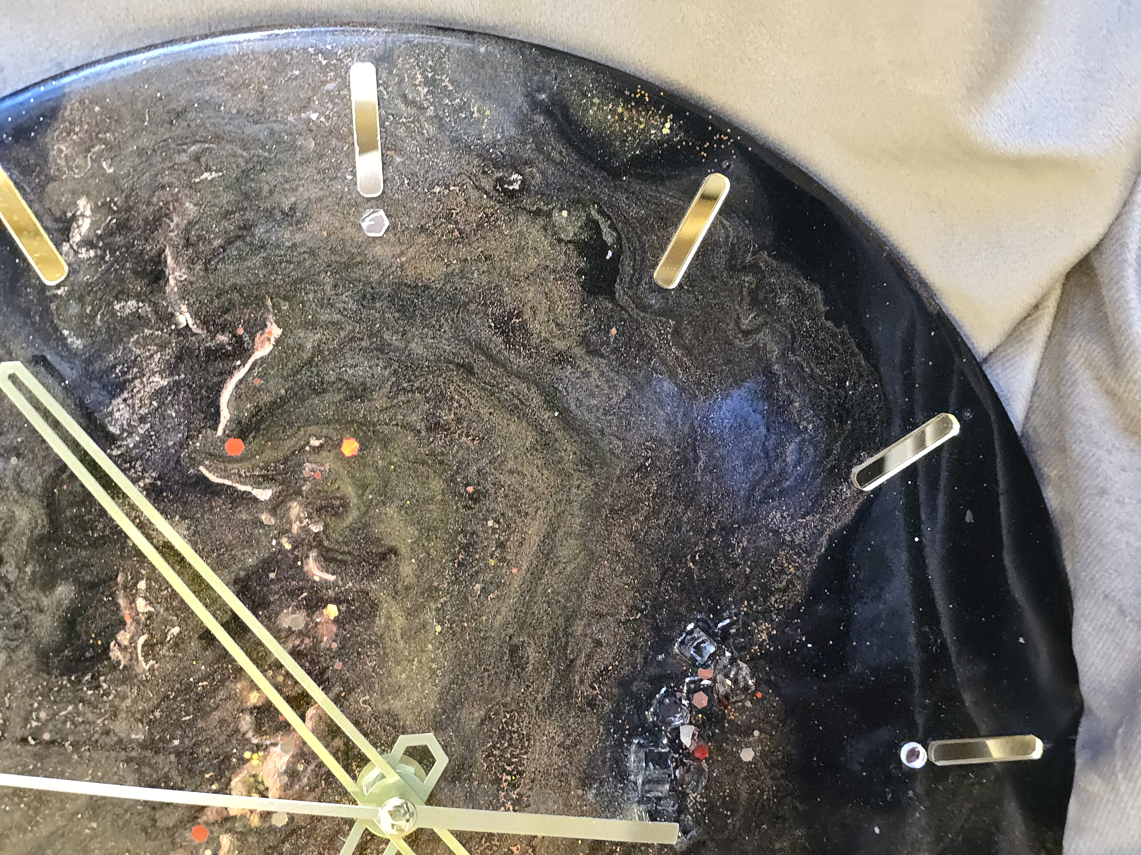 Перед вами — не просто циферблат со стрелками, а арт-объект, создающий настроение в комнате. Тёмная эпоксидная смола с золотистыми и серебристыми вкраплениями напоминает звёздное небо или далёкую туманность. Каждый слой залит вручную — поэтому двух одинаковых часов не существует.