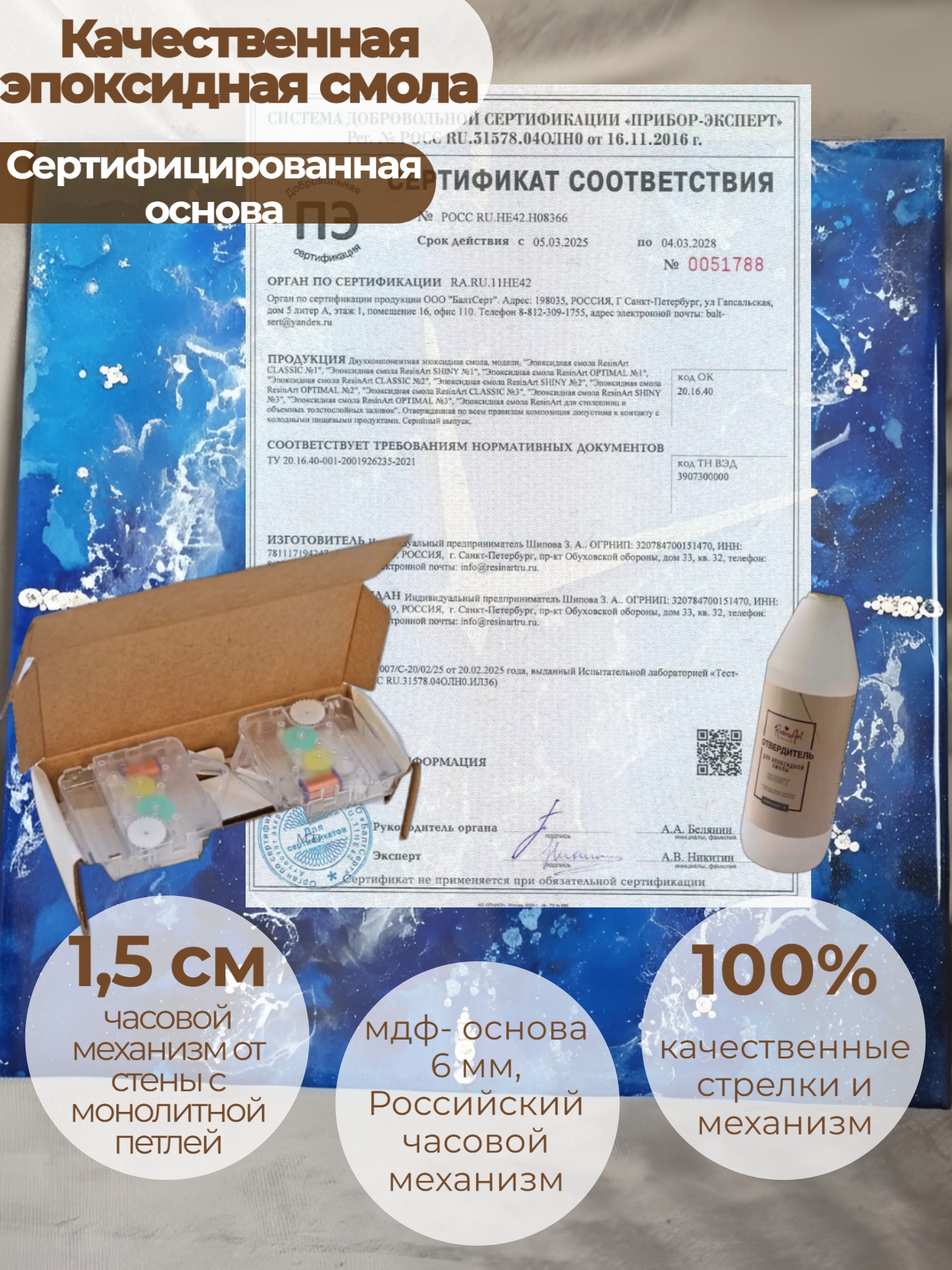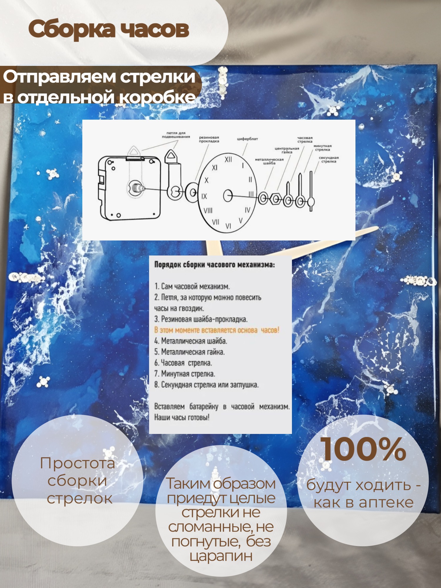Уникальный дизайн: Благодаря ручной работе, каждый циферблат имеет неповторимый узор. Смола может содержать декоративные элементы (блестки, глиттер), создающие эффект глубины.