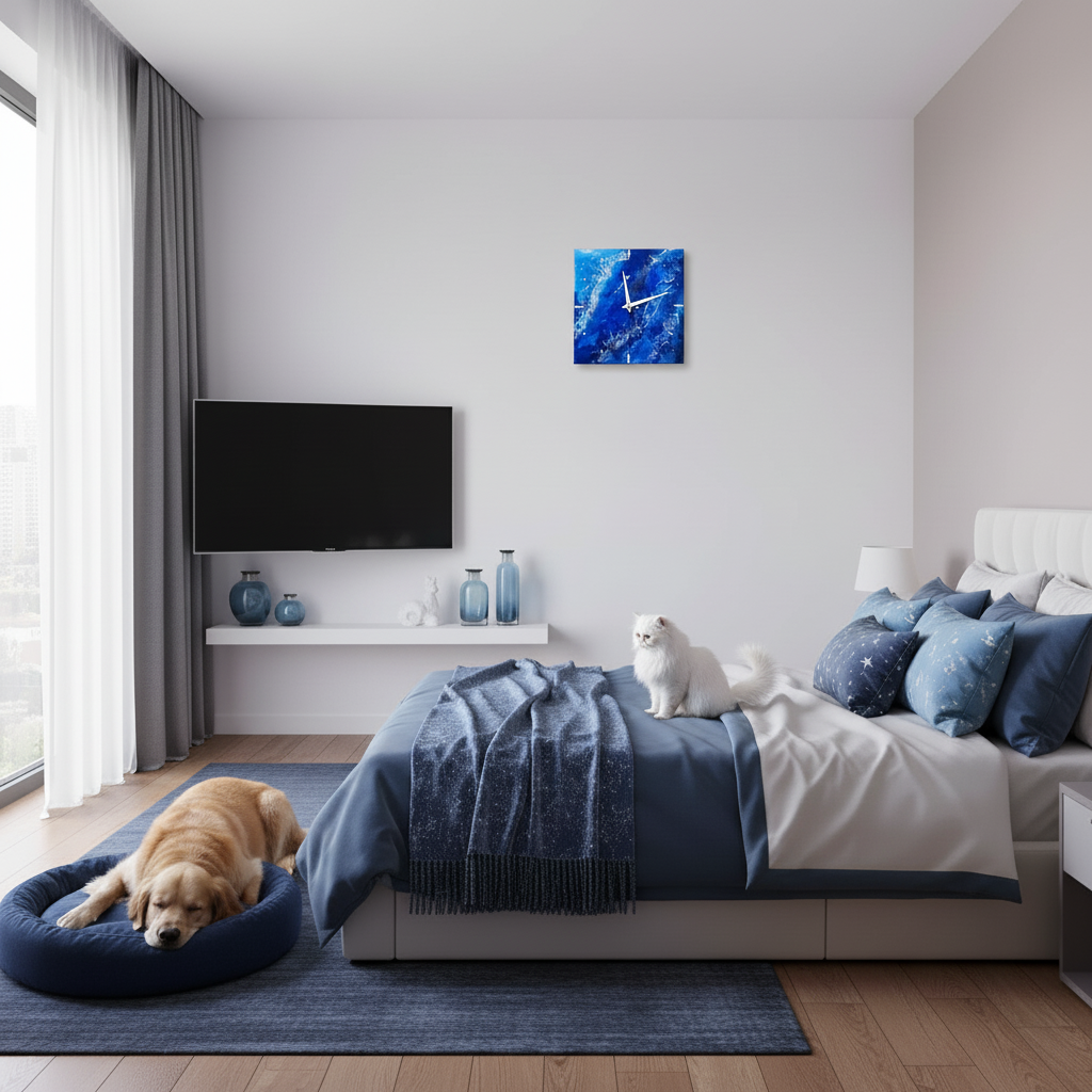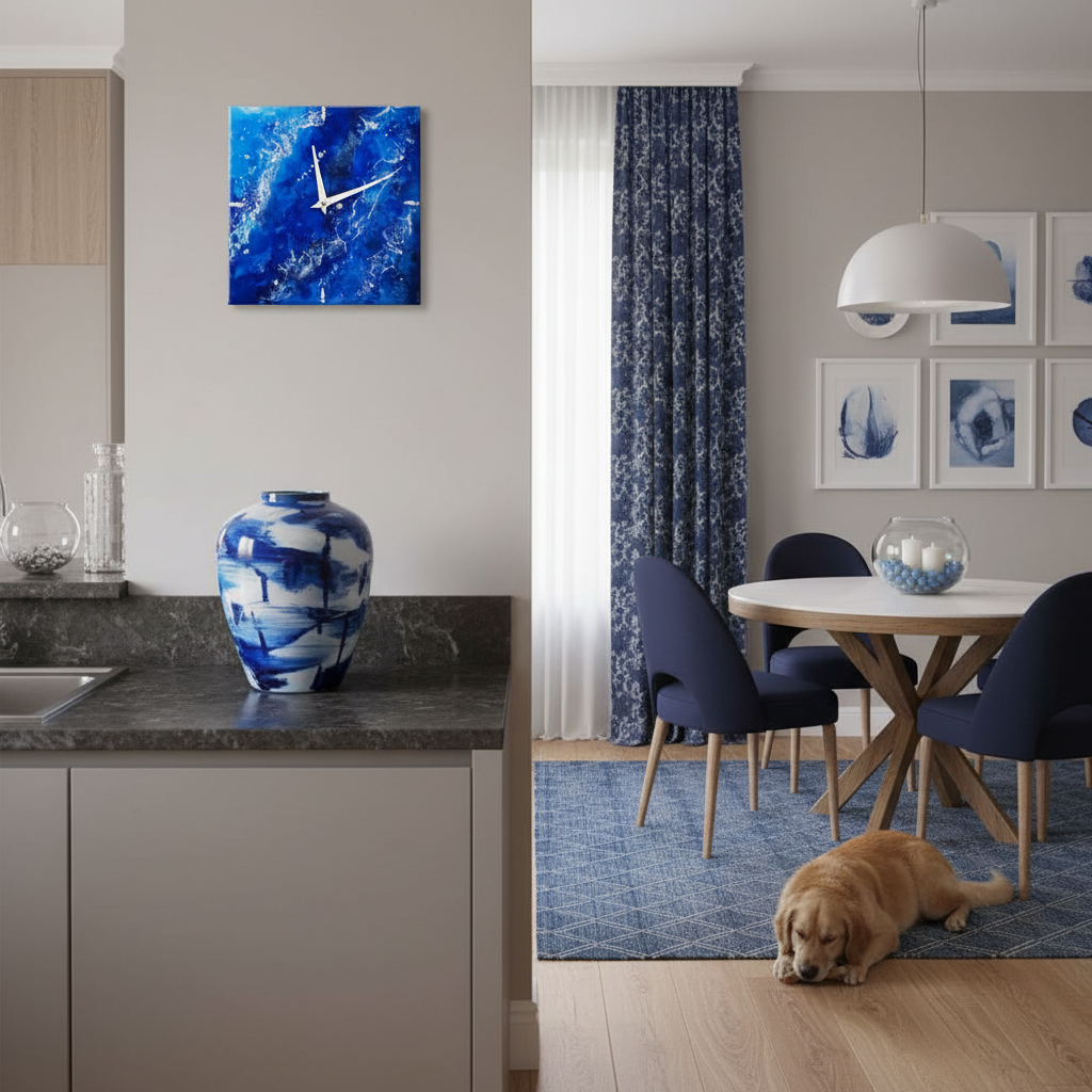 Представляем вам уникальные настенные часы, созданные в технике заливки эпоксидной смолой. Это не просто аксессуар для определения времени, а стильное украшение вашего интерьера. Дизайн «Звездное небо» с глубокими синими оттенками и белыми переливами создает атмосферу уюта и загадочности.