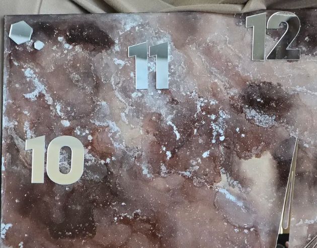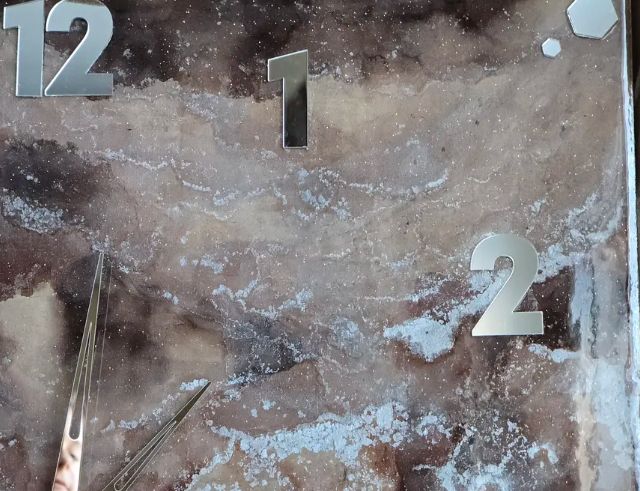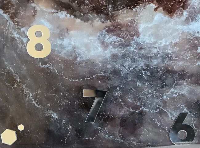 Цифры: Крупные арабские цифры от 1 до 12, расположенные по классическому кругу. Они имеют зеркальное металлическое покрытие серебристого цвета, которое эффектно контрастирует с глубокой текстурой мрамора.