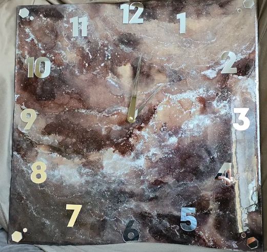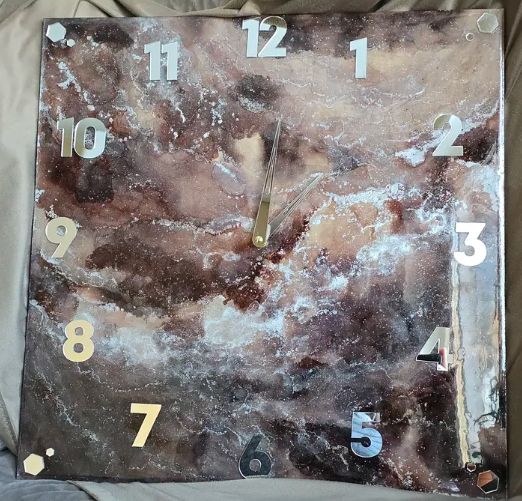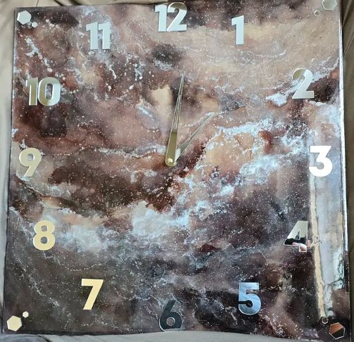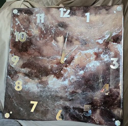 Представляем вам уникальные интерьерные часы квадратной формы размером 50x50 см. Это не просто прибор для измерения времени, а выразительный элемент декора, созданный с использованием эпоксидной смолы. Модель сочетает в себе эстетику мрамора, сияние металла и современный минимализм. Идеально подойдут для интерьеров в стиле лофт, модерн или эклектика.
