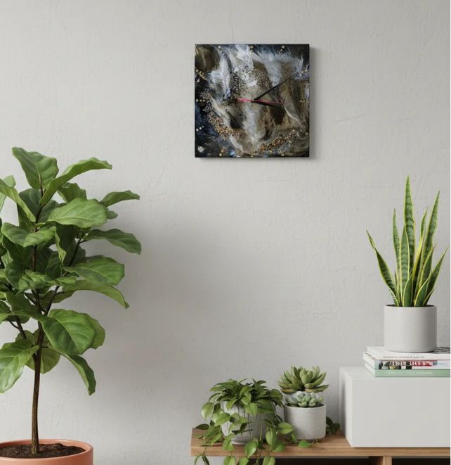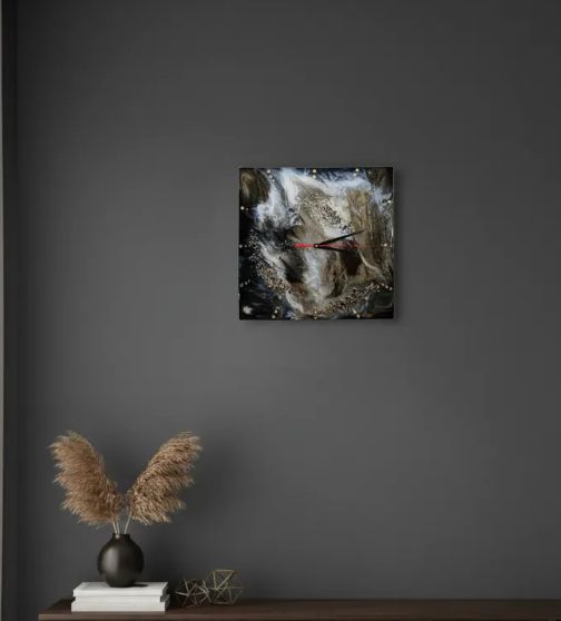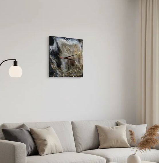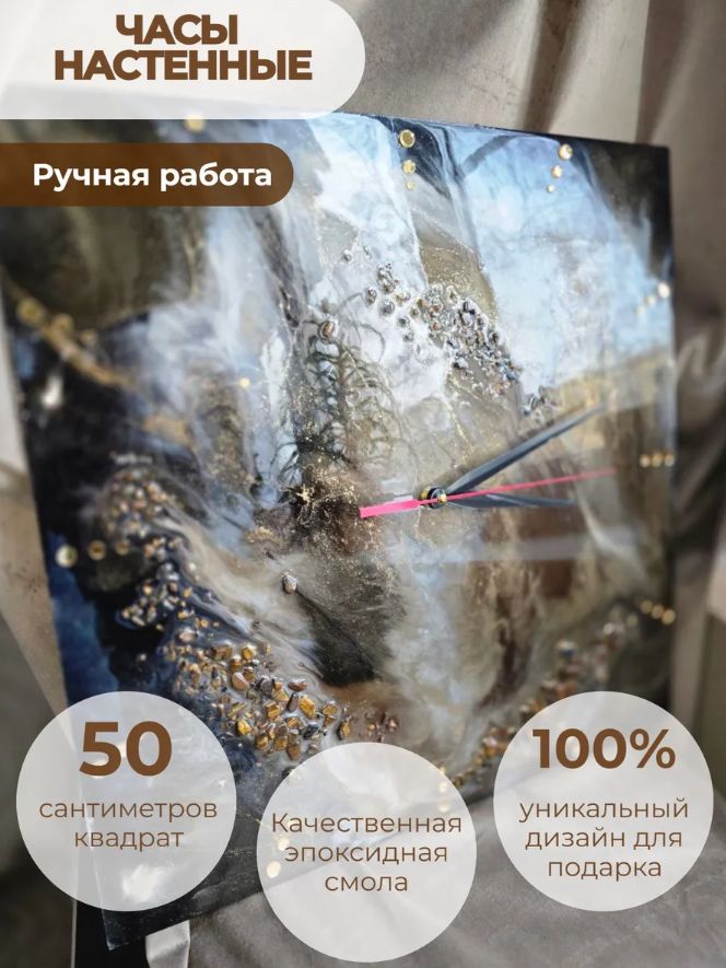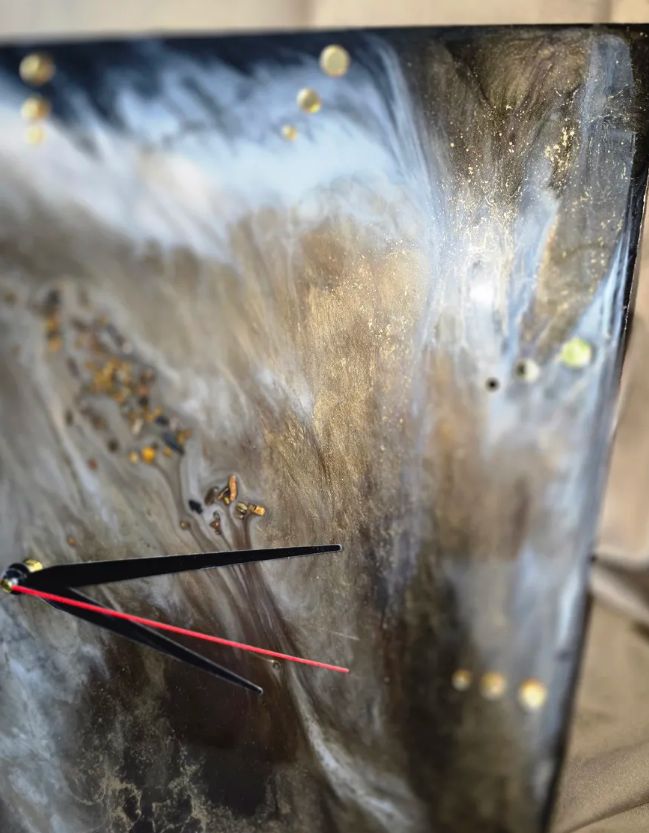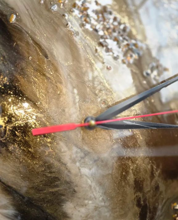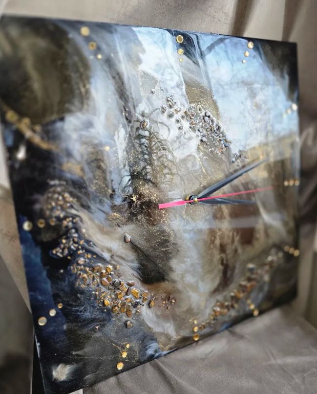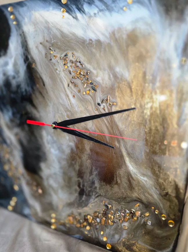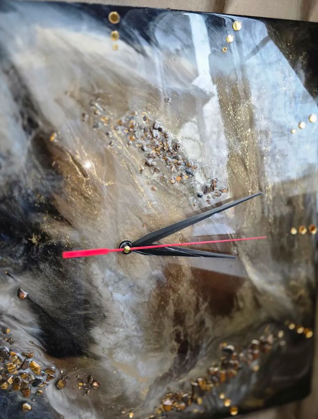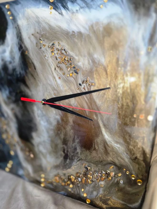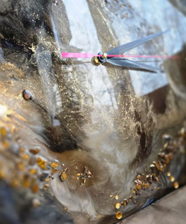 Материалы и отделка: эпоксидка, смола, камень, самоцвет, стрази, стразы, золото, зеркальный, циферблат, стрелки, черные, белые, прожилки, основа, дерево, ДВП, тонкие.