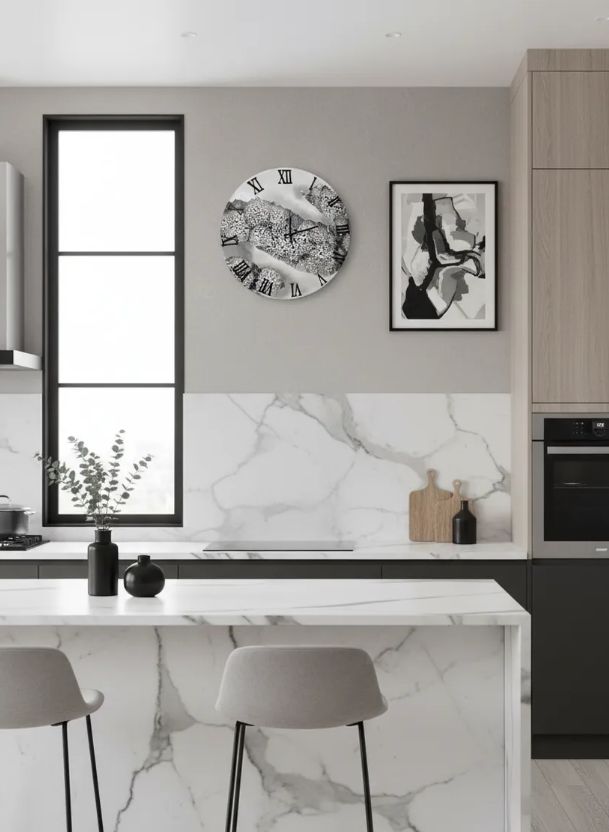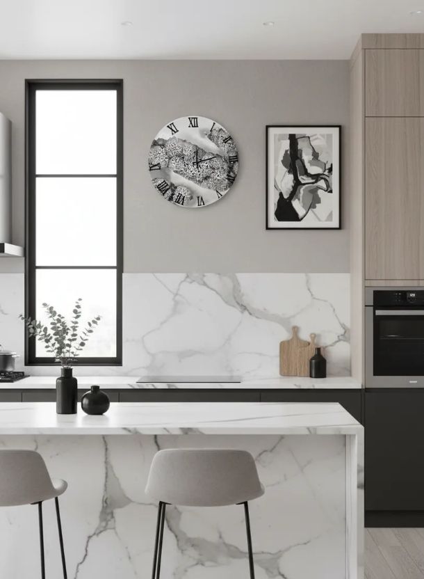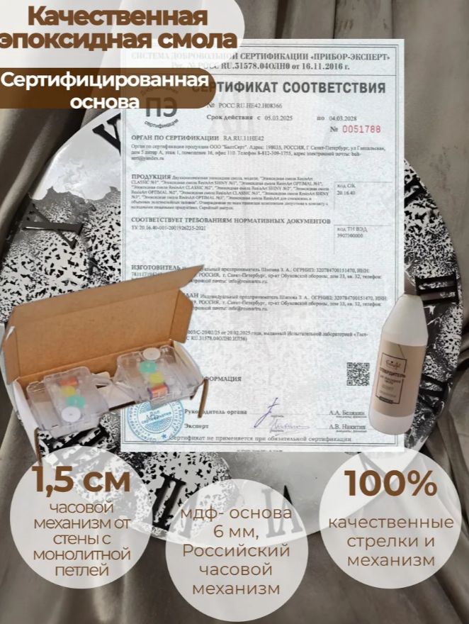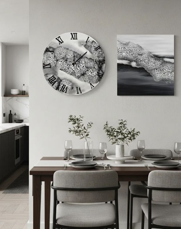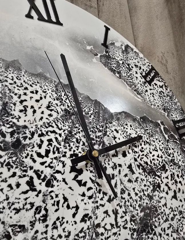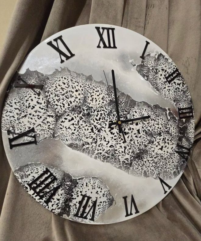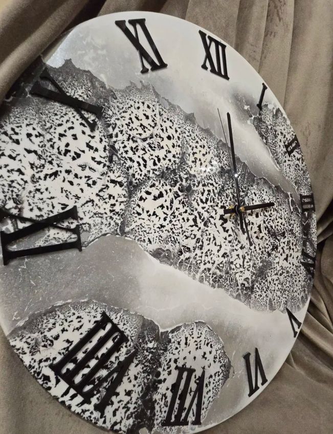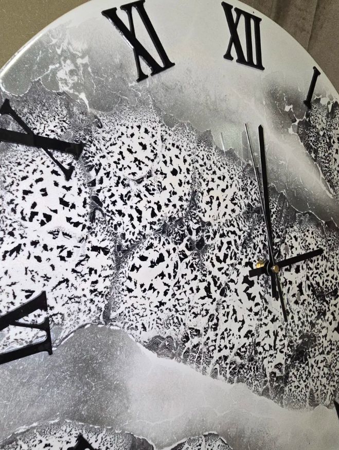 Циферблат выполнен из эпоксидной смолы с россыпью настоящей серебряной вуали, что создает глубокий объемный эффект и игру света. Черно-белая гамма в технике "перепилинное яйцо" дополнена серебристыми пайетками и блестками, добавляющими изысканного сияния. Четкие черные римские цифры и строгие черные металлические стрелки придают композиции завершенность и стиль.