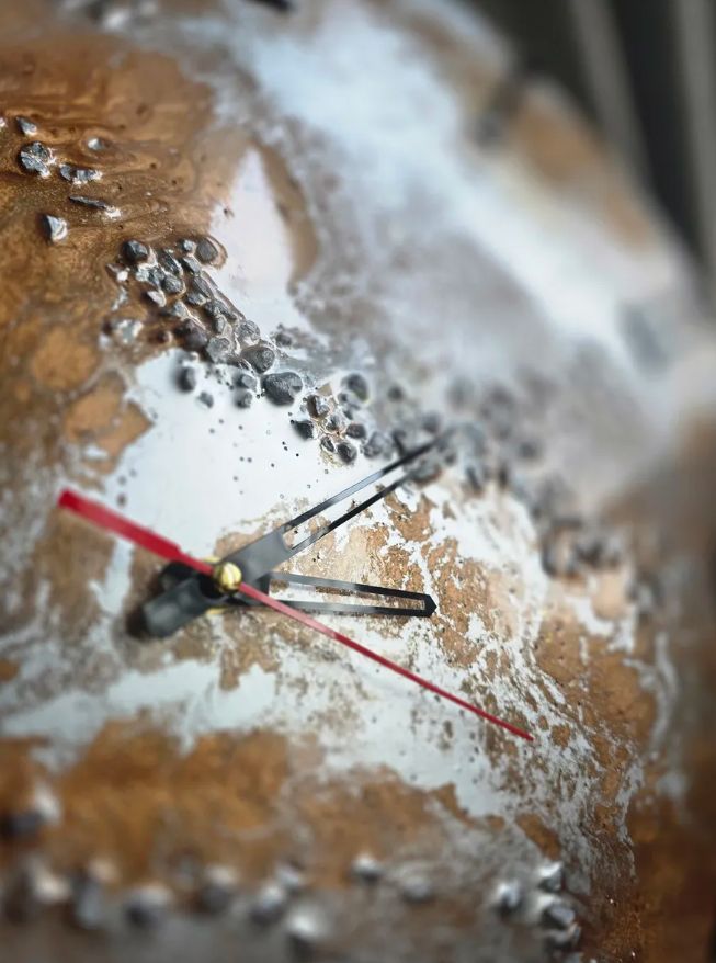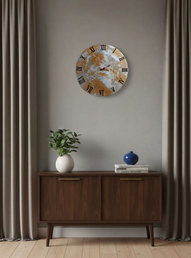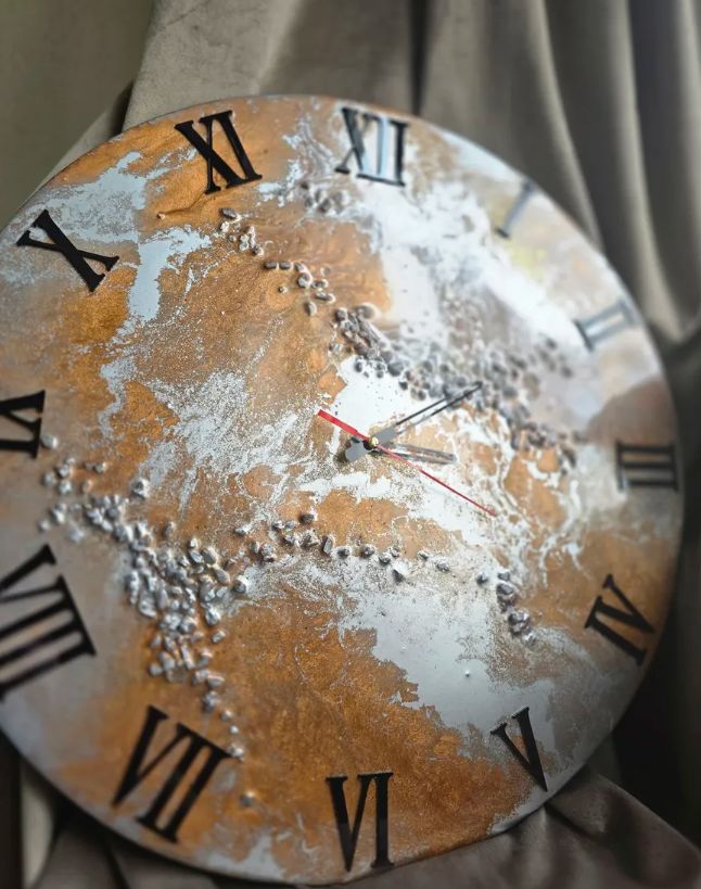 Настенные часы ручной работы "Серебристая элегантность" диаметром 50 сантиметров #настенныечасы #часыручнойработы #эпоксиднаясмола #часыскамнями #часысостразами #римскиецифры #подарочныечасы #дизайнерскиечасы #часывгостиную #эксклюзивныечасы Эти уникальные настенные часы — больше, чем прибор для определения времени. Это авторское произведение искусства, созданное вручную из кристально чистой эпоксидной смолы, которое станет изюминкой вашего интерьера или безупречным подарком для особого случая. Дизайн и материалы: Цветовая гамма: Благородное сочетание серебристых и коричнево-бронзовых оттенков создает глубокий, сложный рисунок с эффектом 3D. Декор: В толщу смолы вручную инкрустированы натуральные серебристые камни и сверкающие стразы, которые играют на свету, добавляя роскоши. Циферблат: Классические черные римские цифры нанесены на внешнюю поверхность, обеспечивая отличную читаемость и элегантный вид. Стрелки: Контрастные черные стрелки завершают лаконичный дизайн. Технические особенности и преимущества: Материал основы: Высококачественная эпоксидная смола — прочная, влагостойкая, с глянцевой поверхностью. Механизм: Надежный кварцевый механизм (батарейка типа АА в комплект не входит). Точный ход и низкий уровень шума. Ручная работа: Каждый экземпляр уникален, рисунок камней не повторяется. Гарантия эксклюзивности. Готово к использованию: Часы полностью готовы к подвешиванию на стену. На задней панели предусмотрено надежное крепление с пятлей на часовом механизме (расстояние от стены 1,5 см). Идея для подарка: Эти часы — идеальный презент на новоселье, юбилей, свадьбу, день рождения или корпоративное событие. Они продемонстрируют ваше внимание к вкусу одариваемого и подчеркнут статусность момента. Уход: Протирайте поверхность мягкой сухой тканью. Избегайте абразивных средств. настенные часы подарочные часы настенные часы ручной работы часы из эпоксидной смолы часы с камнями часы в серебристом цвете часы с римскими цифрами дизайнерские настенные часы интерьерные часы часы для гостиной эпоксидные часы часы с стразами часы в бронзовом цвете черные римские цифры Уникальные, эксклюзивные, авторские. Глянцевые, прозрачные, глубина, сияние. Инкрустация, вставки, декор. Свадебный подарок, юбилей, новоселье, подарок руководителю, коллеге. Современный, люкс, премиум, элитный. Стиль: лофт, модерн, классика, ар-деко, гламур. Для дома, для офиса, для кабинета. Циферблат, стрелки, механизм, кварцевый механизм. Натуральный обсидиан, кристалл, блеск.