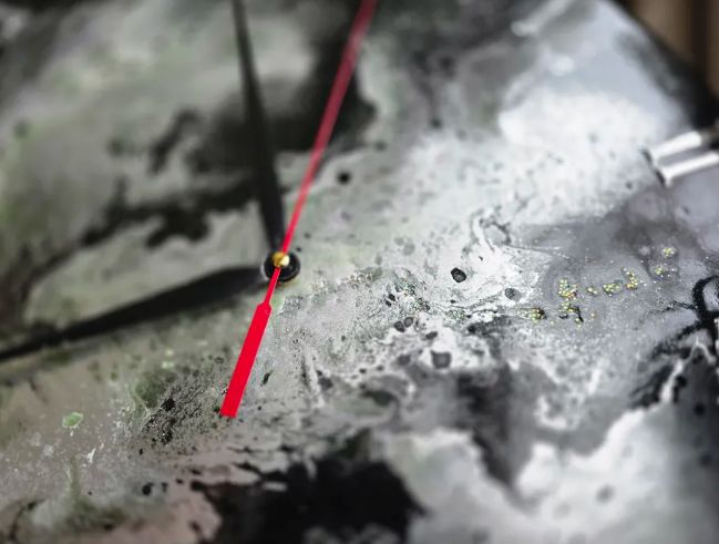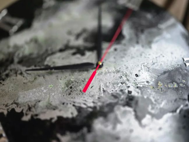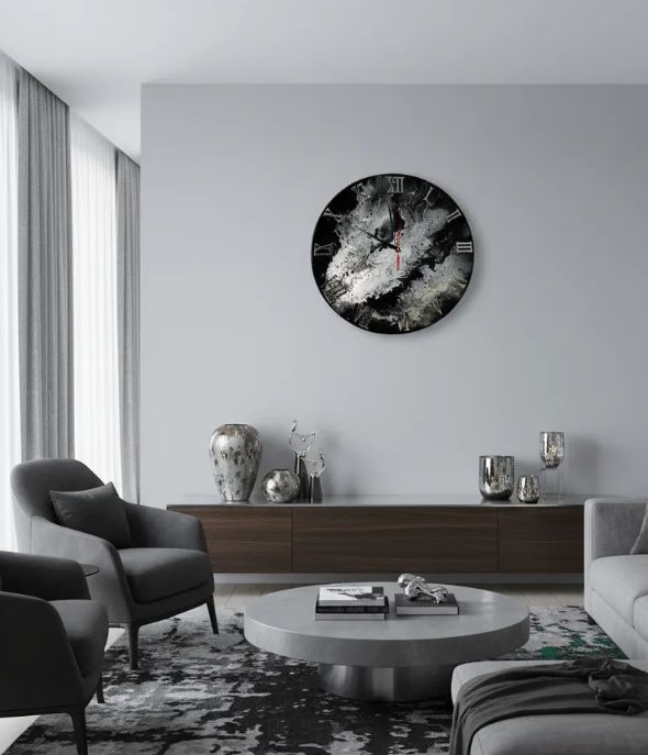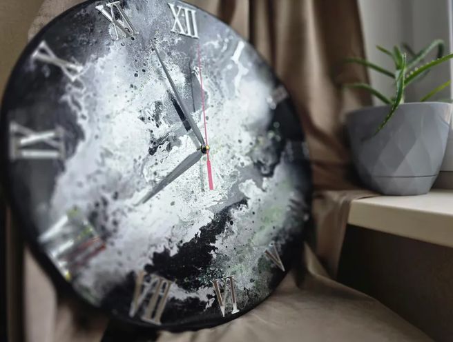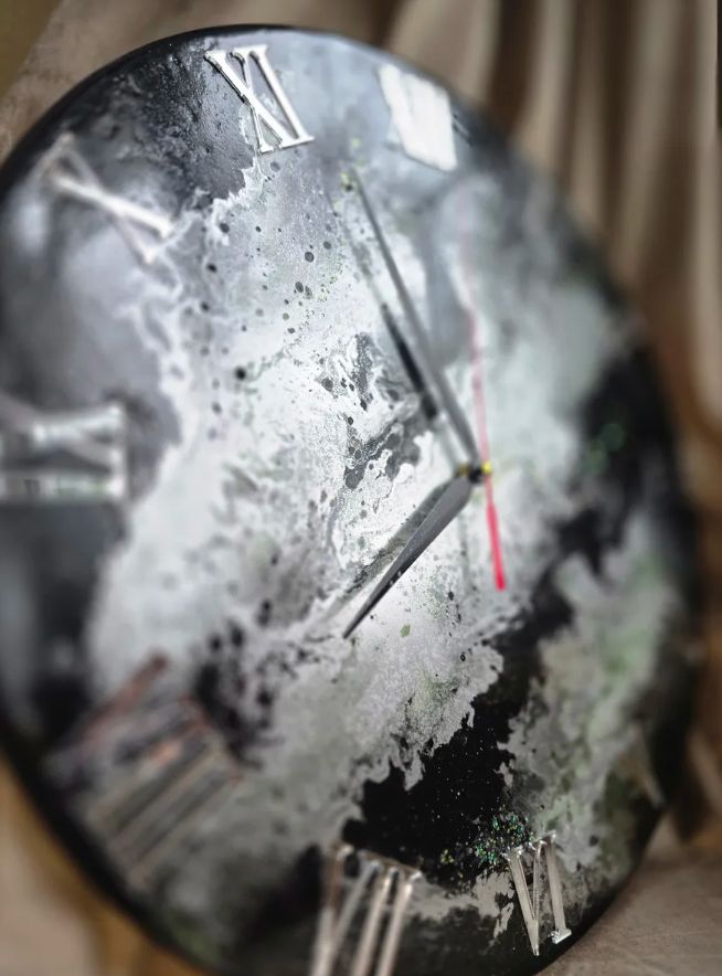Эти настенные часы диаметром 50 см — роскошная доминанта, которая преобразит любое пространство. Глубокий черный цвет эпоксидной смолы, пронизанный изящными серебристыми разводами и зелеными прожилками, создает эффект драгоценного камня. Каждый экземпляр уникален!